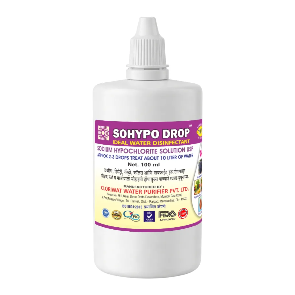 100 ml SOHYPO DROP WATER DISINFECTANT – SODIUM HYPOCHLORITE SOLUTION – PURPLE (ELITE).Β Β FDA LICENCED PRODUCT. GMP CERTIFIED. ISO 9001: 2015 (ISO CERTIFIED)